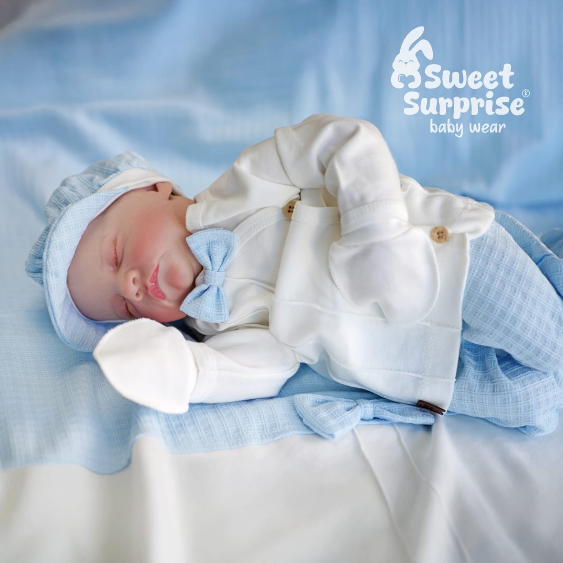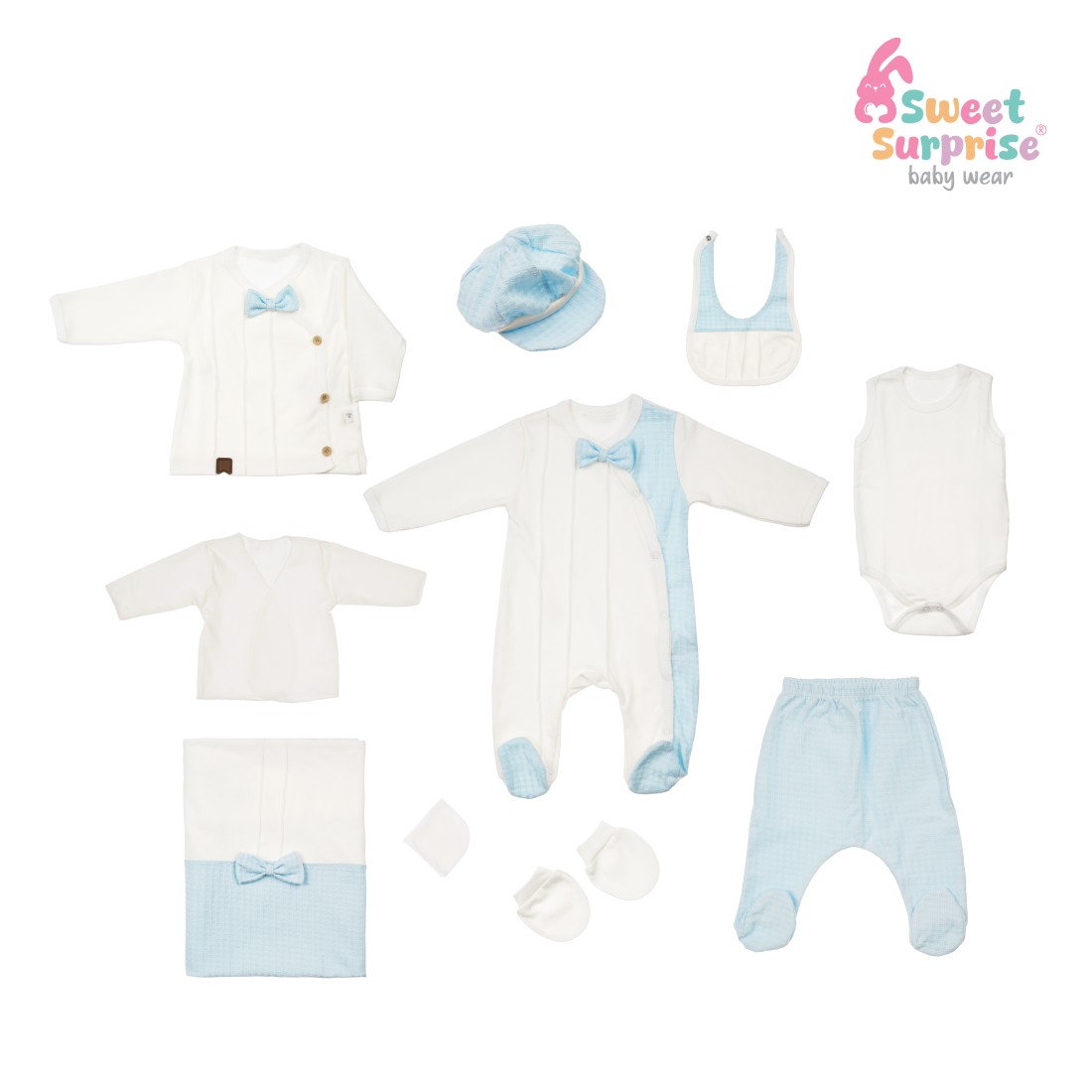 Ürün Adı: SWEET SURPRISE HAVALI PRENS MAVİ %100 PAMUK 10'LU YENİDOĞAN HASTANE ÇIKIŞ SETİ