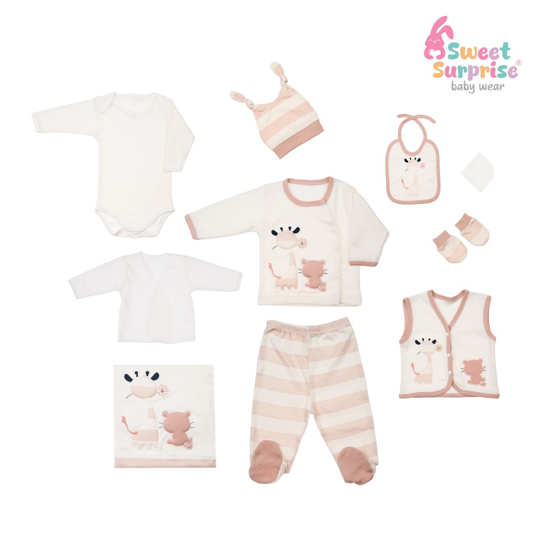 Ürün Adı: SWEET SURPRISE SEVİMLİ KEDİ VE ZÜRAFA PUDRA %100 PAMUK 10'LU YENİDOĞAN HASTANE ÇIKIŞ SETİ